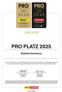 Große Freude: Wir sind „PRO PLATZ 2025“ – ausgezeichnet von der Zeitschrift promobil: „…PRO Plätze 2025. Die besten Stellplätze Deutschlands. Ab sofort vergibt promobil eine neue Auszeichnung für Stellplätze in Deutschland namens PRO Platz 2025. Damit schmücken dürfen sich alle Stellplätze, die von den Usern der Stellplatz-Radar-App überdurchschnittlich gut bewertet wurden.“