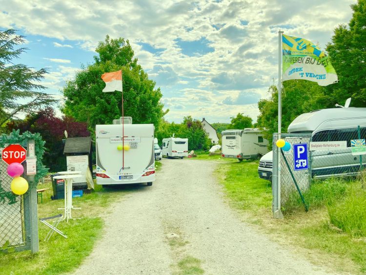 von der Rothenburger Stadtmauer entfernt auf einem Wiesen-Stellplatz ohne Ver- oder Entsorgung stehen.